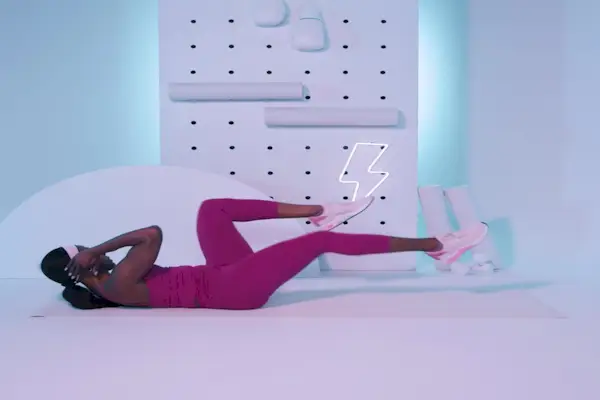 - Lleve la rodilla izquierda hacia el codo izquierdo en un abdominal, involucrando los oblicuos. Eso es 1 repetición.